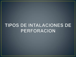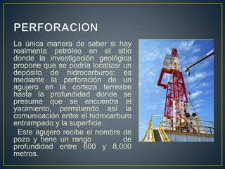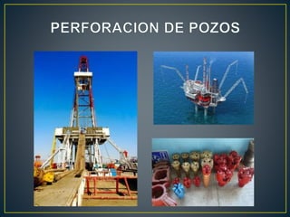 El documento describe los diferentes métodos y etapas del proceso de perforación de pozos petroleros. Se explican los sistemas de elevación, rotación y lodos utilizados durante la perforación, así como los métodos de perforación a percusión y rotatoria. También se mencionan los tipos de equipos de perforación terrestres y marinos y las etapas del proceso de perforación que incluyen la evaluación geológica, exploración, perforación y desarrollo.