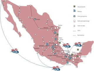 Este documento resume la situación de PEMEX, la empresa petrolera estatal mexicana. Discute cómo PEMEX ha contribuido significativamente al desarrollo de México a través de sus ingresos fiscales, pero también está muy endeudada debido a las altas cargas impositivas y las políticas neoliberales que la han debilitado para beneficiar a las empresas privadas. Argumenta que las privatizaciones y contratos con empresas privadas han violado la Constitución mexicana.