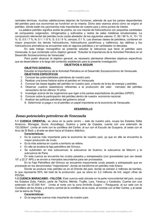 El documento describe la importancia del petróleo para la economía de Venezuela. Se divide en varias secciones, incluyendo una historia del petróleo en Venezuela, las zonas potenciales de petróleo, y el papel del petróleo en la economía actual. El petróleo ha sido fundamental para Venezuela desde la época colonial, cuando se exportaba a España, y sigue siendo el recurso más importante hoy en día, especialmente en la cuenca oriental donde se produce la mayoría del petróleo venezolano.