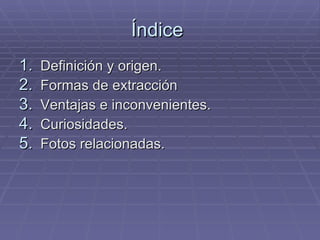 El documento habla sobre el petróleo, definiéndolo como una mezcla orgánica de hidrocarburos que se forma a partir de la transformación de materia orgánica acumulada en el pasado geológico. Explica que se extrae de forma fácil a gran escala pero que su uso contamina la atmósfera y puede agotar las reservas. También menciona que el petróleo se refina en refinerías para obtener productos comercializables.