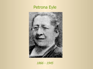 Petrona Eyle fue una escultora y feminista argentina pionera en los derechos de la mujer. Creó varias obras públicas notables como la Fuente de las Nereidas y estatuas de figuras históricas. También presentó iniciativas legislativas al Congreso en favor de la protección a la maternidad, la asistencia social, y la igualdad de derechos civiles para la mujer.