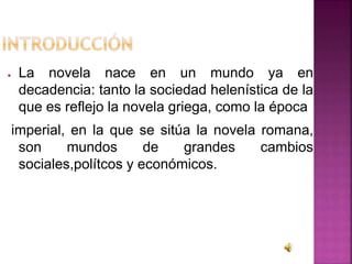La novela nace en épocas de grandes cambios sociales y políticos como el mundo helenístico y el imperio romano. La novela es un género abierto que mezcla historia, ficción, prosa y poesía, así como amores, aventuras, sátira y crítica social. El Satiricón de Petronio es una de las novelas romanas más importantes que sobreviven, conocida por su descripción realista de la decadencia de la época y su retrato de la sociedad a través de las aventuras de sus person