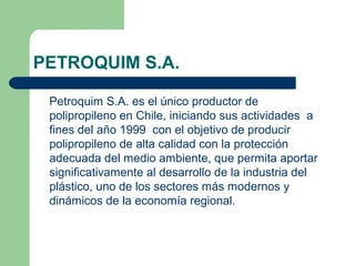 Petroquim S.A. es el único productor de polipropileno en Chile. Comenzó sus operaciones en 1999 con el objetivo de producir polipropileno de alta calidad de manera ambientalmente responsable para apoyar el desarrollo de la industria plástica. Petroquim S.A. produce polipropileno a través de procesos como extrusión, inyección, soplado y termoformado. Mantiene un sistema integrado de gestión de calidad, seguridad y medio ambiente certificado bajo normas internacional