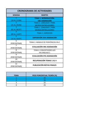 El cronograma detalla las actividades de 11 semanas de un curso sobre lenguaje C para microcontroladores. En la primera semana se introduce el tema 1. Las semanas 2 y 3 cubren el tema 2 sobre lenguaje C. En la semana 4 hay ejercicios del tema 2. En la semana 5 hay exposiciones de la segunda asignación.