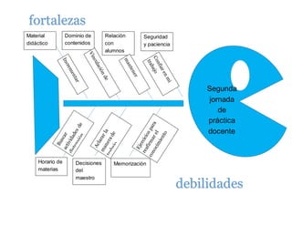 La segunda jornada de práctica docente evaluó las fortalezas y debilidades de los maestros en su material didáctico, dominio de contenidos, relación con los alumnos, seguridad y paciencia, así como su capacidad para gestionar el horario de materias y tomar decisiones como maestro principal.