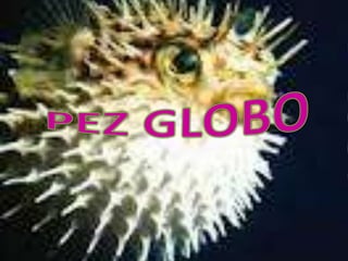 El documento describe las características fisiológicas, morfológicas, ecológicas y genéticas del pez globo. El pez globo tiene espinas venenosas para defensa, vive solitario en aguas tropicales hasta 300 metros de profundidad, y se alimenta de invertebrados y algas. Es casi imposible mantenerlo en cautiverio debido a su veneno mortal.
