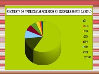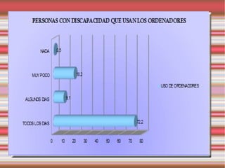 El documento habla sobre cómo las personas con discapacidades u otras desventajas económicas o sociales pueden beneficiarse de las tecnologías de la información y la comunicación (TIC). Se enfoca en dos tipos comunes de discapacidad - discapacidades visuales y motoras - y cómo sitios web accesibles pueden ayudar a estas personas. También menciona una fundación llamada Fundación Tecnológica Social que trabaja para promover el acceso igualitario a Internet y mejorar el desarrollo personal a través de las TIC.
