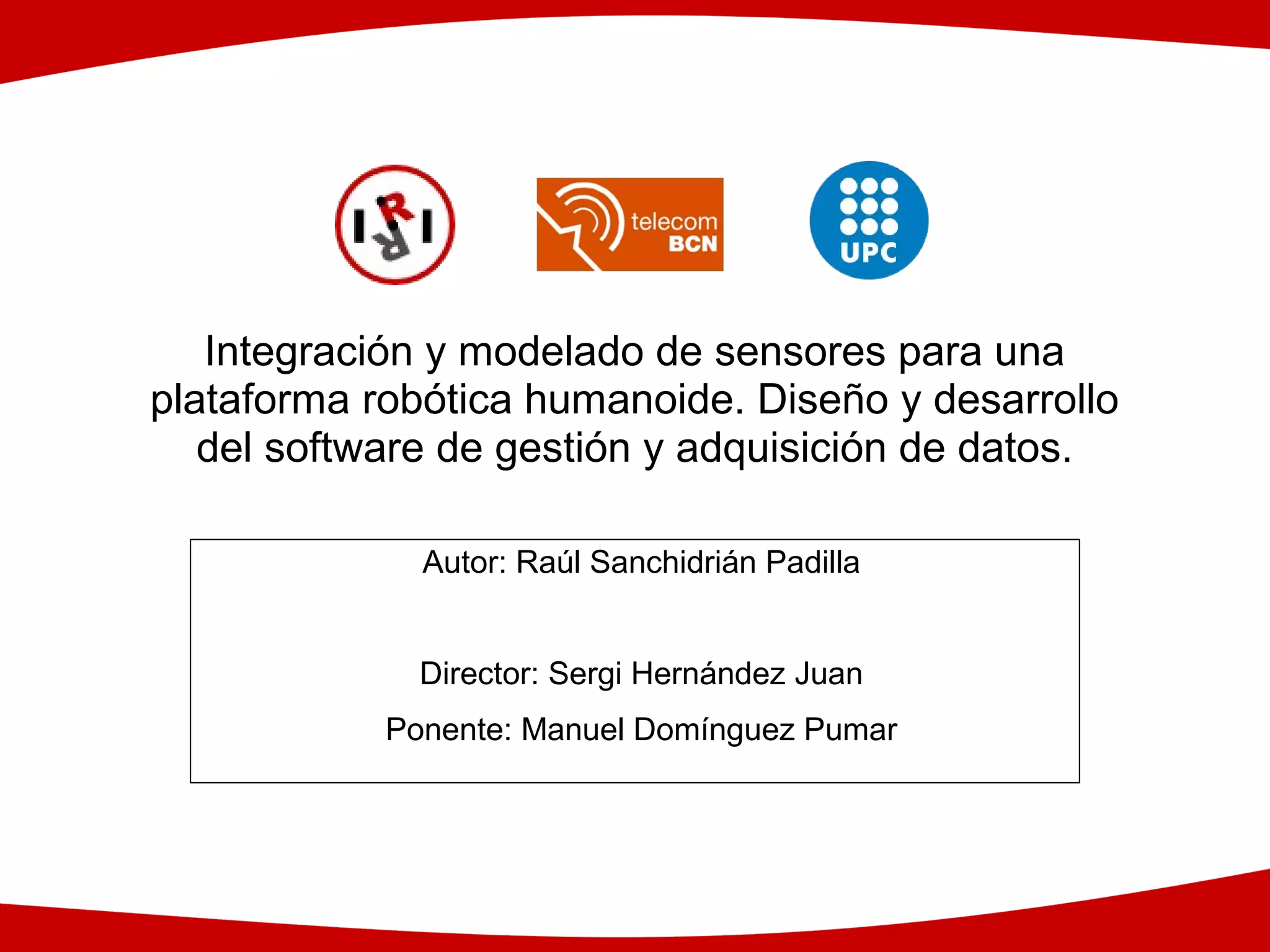 El documento presenta el diseño y desarrollo de un software para gestionar y adquirir datos de una plataforma robótica humanoide, integrando diversos sensores como infrarrojos y acelerómetros. Se expone el modelado de los sensores para evitar calibración y se detalla la estructura del software que permite monitorización remota. Se concluye con la creación de una librería que facilita la configuración de hardware y se plantean perspectivas futuras para optimizar el sistema.