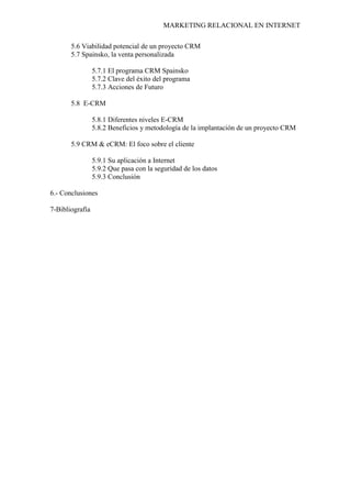 Este documento trata sobre el marketing relacional en Internet. Explica conceptos clave como marketing, marketing relacional, marketing masivo vs marketing 1x1. También analiza el uso de herramientas como CRM y cómo estas permiten a las empresas conocer mejor a sus clientes de forma individualizada a través del uso de bases de datos e Internet, con el objetivo de establecer relaciones duraderas. Finalmente, discute cómo el marketing relacional se ha vuelto cada vez más importante para las empresas en la actual era digital.