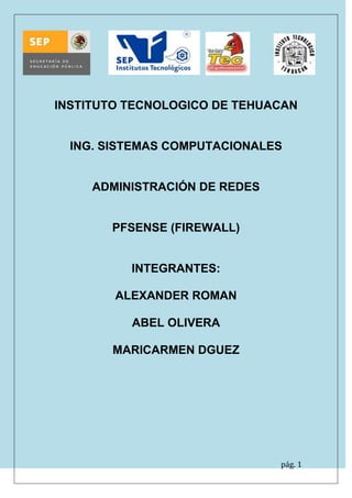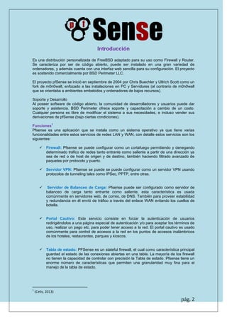 Este documento proporciona una introducción y guía de instalación de pfSense, un firewall basado en FreeBSD. Explica que pfSense es de código abierto y se puede instalar en varios tipos de hardware. Detalla los pasos para instalar pfSense, incluida la configuración de las tarjetas de red y la asignación de direcciones IP. También explica cómo acceder a la interfaz web de pfSense una vez instalado para configurar reglas de firewall y otros servicios de red.