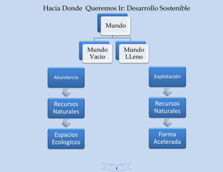 El documento presenta estrategias para lograr un desarrollo sostenible, incluyendo opciones políticas, de ingeniería, cambios en los patrones de consumo, y mercados libres. Propone cuatro enfoques factibles para el viaje hacia la sostenibilidad: política, imperial, ingeniería, y naturaleza funciona.