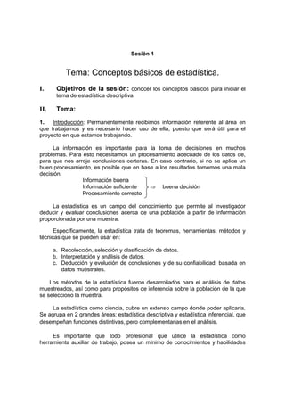 Este documento presenta los conceptos básicos de estadística descriptiva e inferencial. Explica que la estadística permite deducir conclusiones sobre una población a partir de una muestra. Define los conceptos clave de población, muestra, variable, parámetro y estadístico. Describe las diferencias entre estadística descriptiva e inferencial. Finalmente, propone ejercicios prácticos para aplicar estos conceptos.