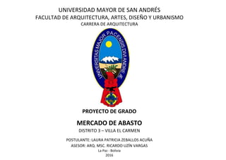 Este documento presenta un proyecto de grado para la renovación del mercado de Villa Fátima en La Paz, Bolivia. Explica que el mercado actual ya no tiene la capacidad para albergar a todos los comerciantes debido al crecimiento de la actividad comercial. Identifica varios problemas relacionados con la falta de espacio e infraestructura como la acumulación de basura, el tráfico vehicular y la inseguridad. El objetivo general del proyecto es mejorar las condiciones del mercado para satisfacer las nuevas necesidades generadas por su const