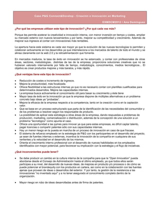 Este documento describe los beneficios y desafíos de la innovación abierta, como la utilizada por P&G. Algunas ventajas incluyen reducir costos, mejorar la productividad y la tasa de éxito en la innovación. Sin embargo, también requiere cambios culturales dentro de la organización y mayor riesgo de robo de propiedad intelectual. Para implementarla efectivamente, la estrategia debe ser promovida por los líderes y se recomienda involucrar a los clientes para garantizar el éxito comercial de nuevos lanzam