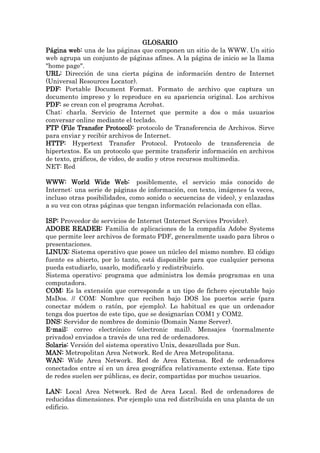 El documento proporciona definiciones de varios términos técnicos relacionados con computadoras e Internet. Explica conceptos como página web, URL, PDF, chat, FTP, HTTP, correo electrónico, Linux, sistema operativo, DNS, Adobe Reader, Solaris, LAN, WAN, interfaz, navegador web, dominio, explorador web, servidor, archivo, virus, teclado, protocolo, directorio, hipertexto, blog, proveedor de servicios de Internet, enlaces, buscador, módem, hipervínculo
