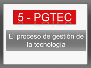 El documento describe el proceso de gestión de la tecnología en una empresa. Primero, analiza los factores del entorno como los socioculturales, económicos, políticos y tecnológicos que afectan a las empresas. Luego, explica cómo las estrategias tecnológicas han evolucionado a lo largo de los años para adaptarse a los cambios. A continuación, detalla cómo la tecnología influye en la estructura del mercado según las 5 fuerzas de Porter. Finalmente, resume los pasos clave del plan tecnológico