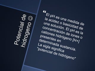 El pH es fundamental para el funcionamiento del cuerpo humano y la industria alimentaria. La sangre mantiene un rango estrecho de pH entre 7.35 y 7.45 gracias al equilibrio de ácidos y bases en el cuerpo. Es importante medir y mantener el balance de pH usando productos como antiácidos, leche de magnesia o jabón neutro. Las tiras de tornasol son una forma sencilla de medir si una sustancia es ácida o básica. La escala de pH va de 0 a 14, con lecturas menores a 7 indicando sol