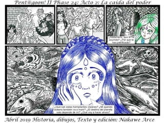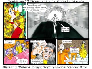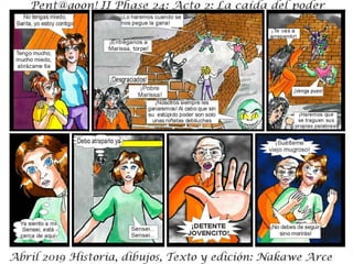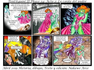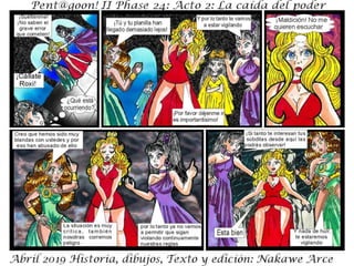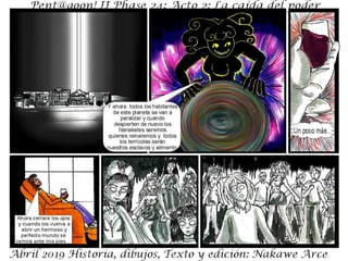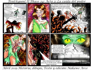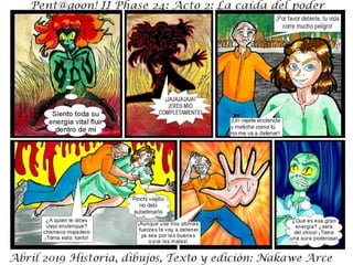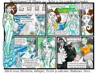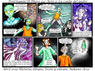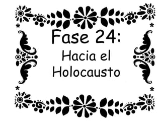 El documento describe la fase 24 de una narrativa ficticia titulada 'la caída del poder', que aborda temas de conflicto y holocausto. Incluye personajes y situaciones que no tienen relación con la realidad. Se advierte que es una obra de ficción y que cualquier coincidencia es accidental.