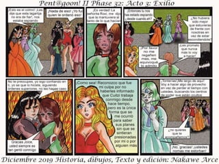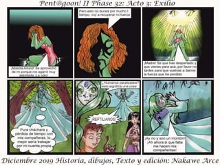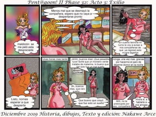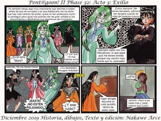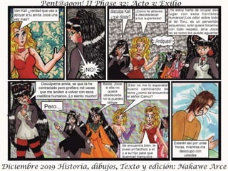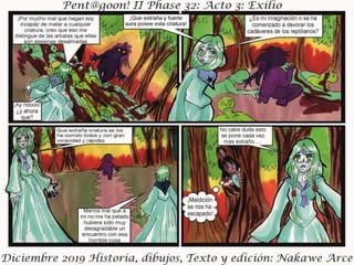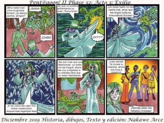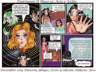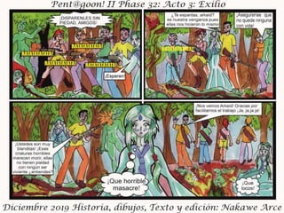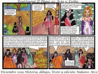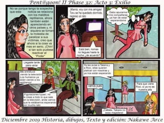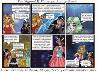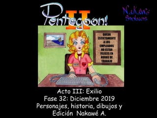 El documento presenta el acto III de 'Exilio Fase 32', fechado en diciembre de 2019, con personajes, historia, dibujos y edición por Nakawé A. Se destaca que las situaciones y personajes son ficticios y cualquier parecido con la realidad es pura coincidencia. Se sugiere que la narrativa y desarrollo continuará en futuras entregas.