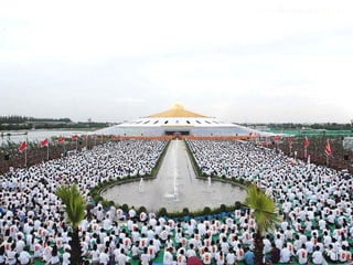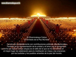 El documento describe el Dhammakaya Cetiya en Tailandia, un gran monumento budista construido con donaciones públicas para representar la unidad y el amor por la humanidad. El Cetiya fue diseñado para contener 1 millón de imágenes de Buda y alberga eventos de meditación masiva y oración para promover la paz mundial. También describe las instalaciones asociadas como el Salón de la Asamblea Dhammakaya, que puede albergar a 150.000 personas, y el comedor Khun Yay Archaraya Chandra Khonn
