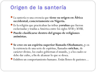 El documento describe los orígenes y creencias de la santería, una religión sincrética que mezcla elementos de las creencias yorubas de África occidental con el cristianismo. La santería surgió como una forma de los esclavos yorubas traídos a América de continuar practicando su religión mientras aparentaban haberse convertido al cristianismo. Cree en una serie de espíritus llamados orichas a los cuales se les rinde culto y que fueron identificados con santos católicos.