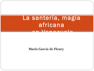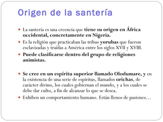 El documento resume los orígenes y creencias de la santería, una religión sincrética que mezcla elementos de las creencias yorubas de África con el catolicismo. Los yorubas identificaron a sus orichas con santos católicos para ocultar su fe ante los colonizadores. La santería incluye la magia, la adivinación y el culto a espíritus como Changó y Yemayá. El Palo Congo es otra religión afroamericana que incluye el pacto con espíritus de muertos. La Bib