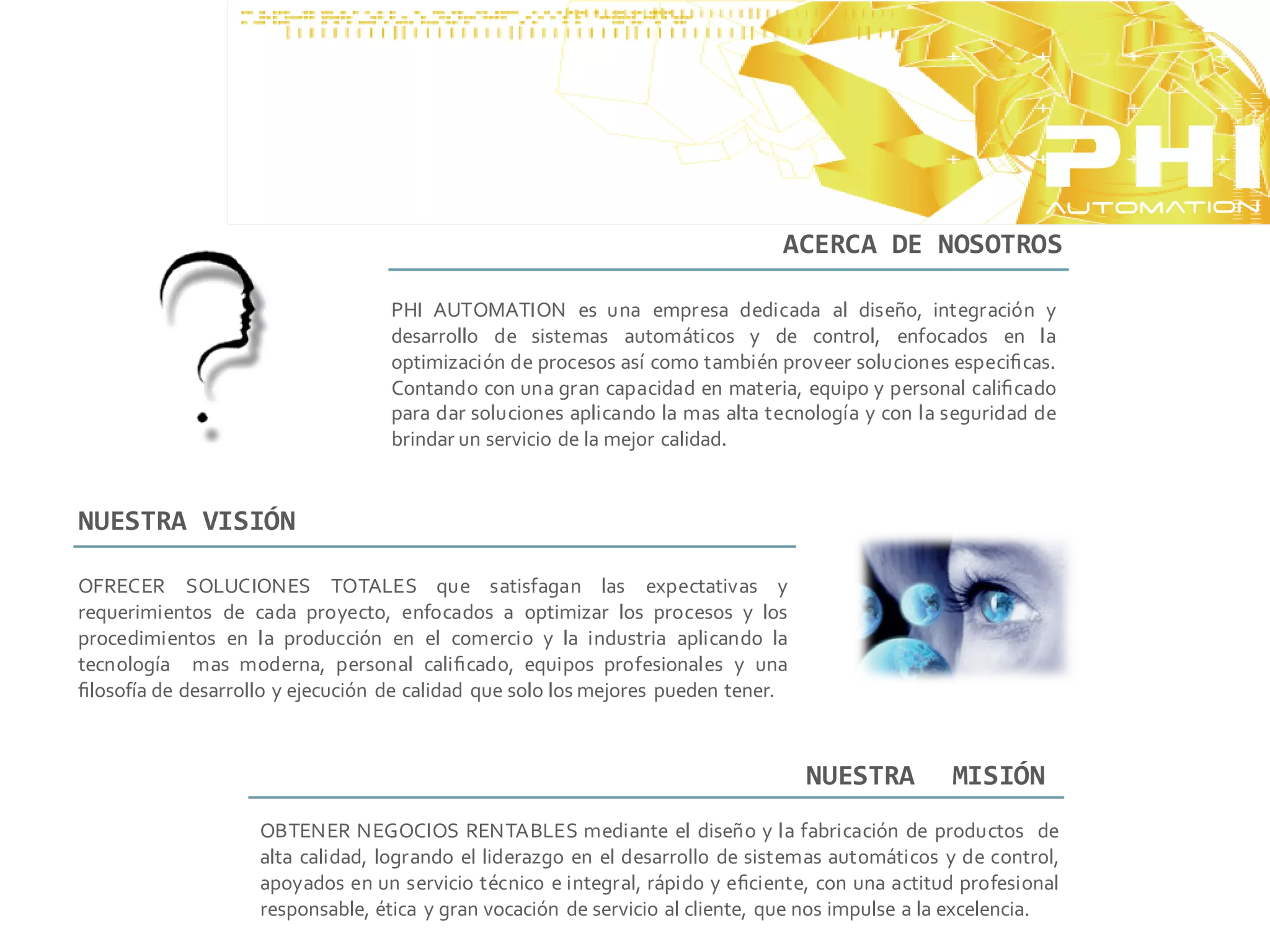 PHI AUTOMATION se dedica al diseño, integración y desarrollo de sistemas automáticos y de control para optimizar procesos, ofreciendo soluciones con la más alta tecnología y calidad. Su visión es ofrecer soluciones totales aplicando tecnología moderna y su misión es lograr negocios rentables mediante productos de alta calidad y liderazgo en sistemas automáticos con un excelente servicio al cliente.