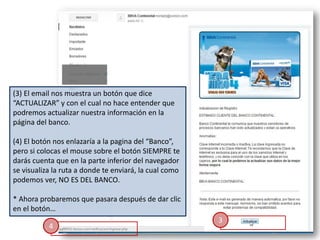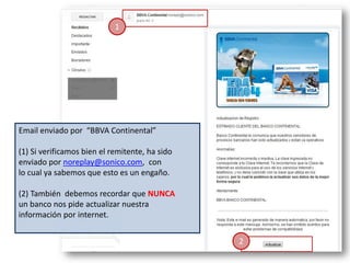 Un email fraudulent o de 'bbva continental' enviado desde noreplay@sonico.com intenta engañar a los usuarios para que actualicen su información personal. Este tipo de fraude, conocido como phishing, utiliza un enlace que parece legítimo, pero que redirige a una página falsa que no está protegida. Es fundamental verificar siempre la dirección web y recordar que los bancos nunca solicitan información confidencial por internet.