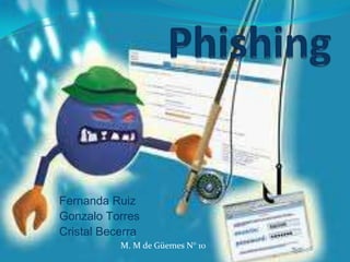 El documento define el phishing como estafas que buscan obtener datos personales de usuarios a través de mensajes, llamadas o sitios web falsos. Explica que los phishers usan principalmente correos electrónicos para engañar a las víctimas y robar su información confidencial. Finalmente, recomienda no responder solicitudes de datos personales por correo, verificar la autenticidad de los sitios web y no abrir archivos adjuntos no esperados para prevenir este tipo de fraude.