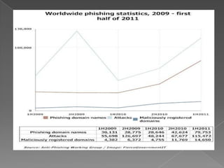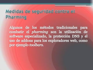 El phishing consiste en enviar correos electrónicos falsos que pretenden ser de entidades confiables para robar información personal y financiera de los usuarios. Estos correos incluyen enlaces a páginas web falsas donde se solicita la información confidencial. Debido al aumento de estas estafas, se han implementado leyes y campañas de prevención, pero aún se requieren mayores medidas de protección.