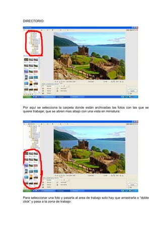 Este documento proporciona instrucciones detalladas para descargar, instalar y utilizar el programa PhotoScape. Explica cómo abrir y trabajar con fotos en el editor de fotos, incluidas herramientas como el pincel, el clonado y el recorte. También describe cómo guardar los cambios y deshacer acciones para evitar la pérdida de trabajo. El objetivo es enseñar al lector a utilizar las funciones básicas del editor de fotos de PhotoScape de una manera sencilla y práctica.