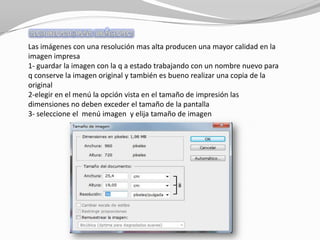 Para editar imágenes en Photoshop se recomienda guardar las imágenes en formato PSD para conservar capas y flexibilidad. Las imágenes con alta resolución producen mejor calidad al imprimir. Es importante guardar copias de seguridad de las imágenes originales antes de realizar ediciones.