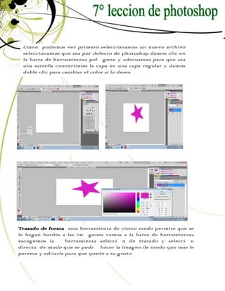 Este documento resume las herramientas de formas, trazados, capas, estilos, varita mágica, marco, lazo poligonal y máscaras vectoriales en Photoshop. Explica cómo crear y editar formas, aplicar estilos y filtros a selecciones, y usar máscaras para ocultar y revelar partes de imágenes.