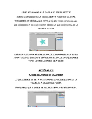 Este documento presenta 9 actividades sobre el uso de herramientas básicas en Photoshop como dibujar formas, ajustar trazos, agregar y quitar formas, modificar formas con estilos de capa, utilizar la varita mágica, cambiar colores con filtros de fotografía, usar la herramienta marco, crear selecciones con el lazo poligonal y crear máscaras vectoriales. Cada actividad explica paso a paso cómo utilizar una herramienta o función específica de Photoshop para editar y modificar imá