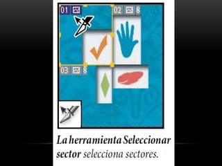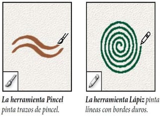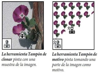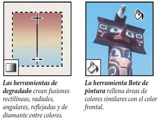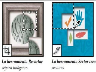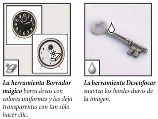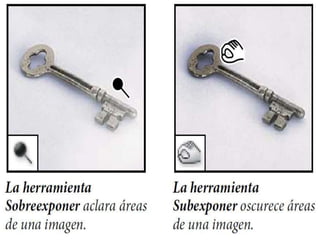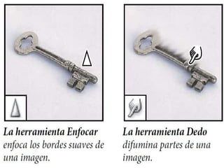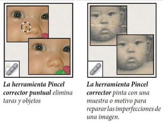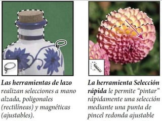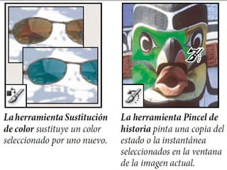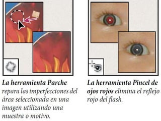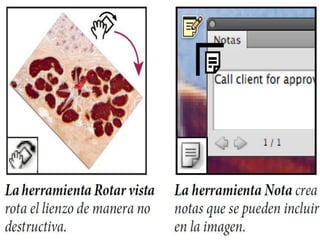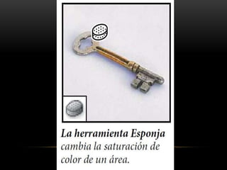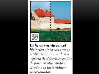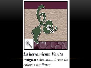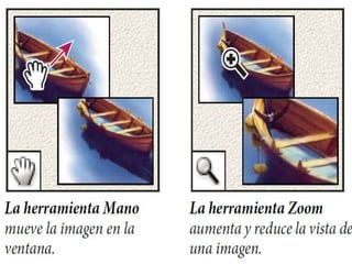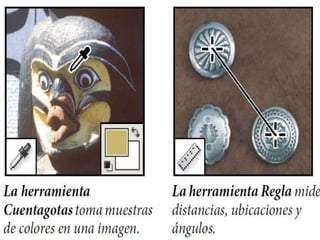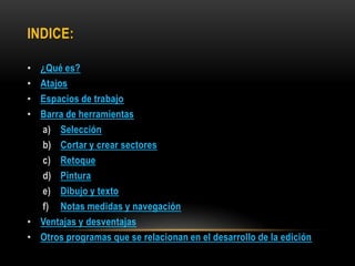 Photoshop es un programa de edición de imágenes que permite realizar retoques fotográficos y diseños visuales. Ofrece varias herramientas organizadas en barras para seleccionar, cortar, retocar, pintar, dibujar y medir. También proporciona espacios de trabajo para edición de fotos, diseño, pintura y 3D. Algunas ventajas son su versatilidad y compatibilidad con diferentes formatos, aunque requiere habilidad y hardware potente. Programas relacionados como Adobe Bridge y Camera Raw permiten organ