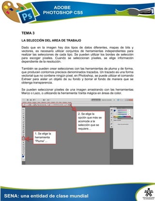 El documento describe diferentes herramientas y técnicas en Photoshop para realizar selecciones de píxeles y vectores, incluyendo el uso de las herramientas Lazo, Marco Rectangular y Varita Mágica. También explica cómo suavizar los bordes de una selección y ajustarla a guías u otros elementos, así como cómo recortar siluetas para aislar figuras con un fondo difuminado. El objetivo es proporcionar instrucciones paso a paso sobre cómo realizar diferentes tipos de selecciones en Photoshop.