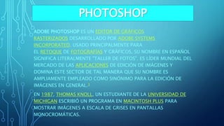 Adobe Photoshop es un programa de edición de imágenes desarrollado por Adobe. Se usa principalmente para el retoque de fotografías y gráficos. Fue creado en 1991 y soporta múltiples formatos de archivo de imagen. Incluye herramientas como pinceles, recuadros, texto y varita mágica para editar imágenes.