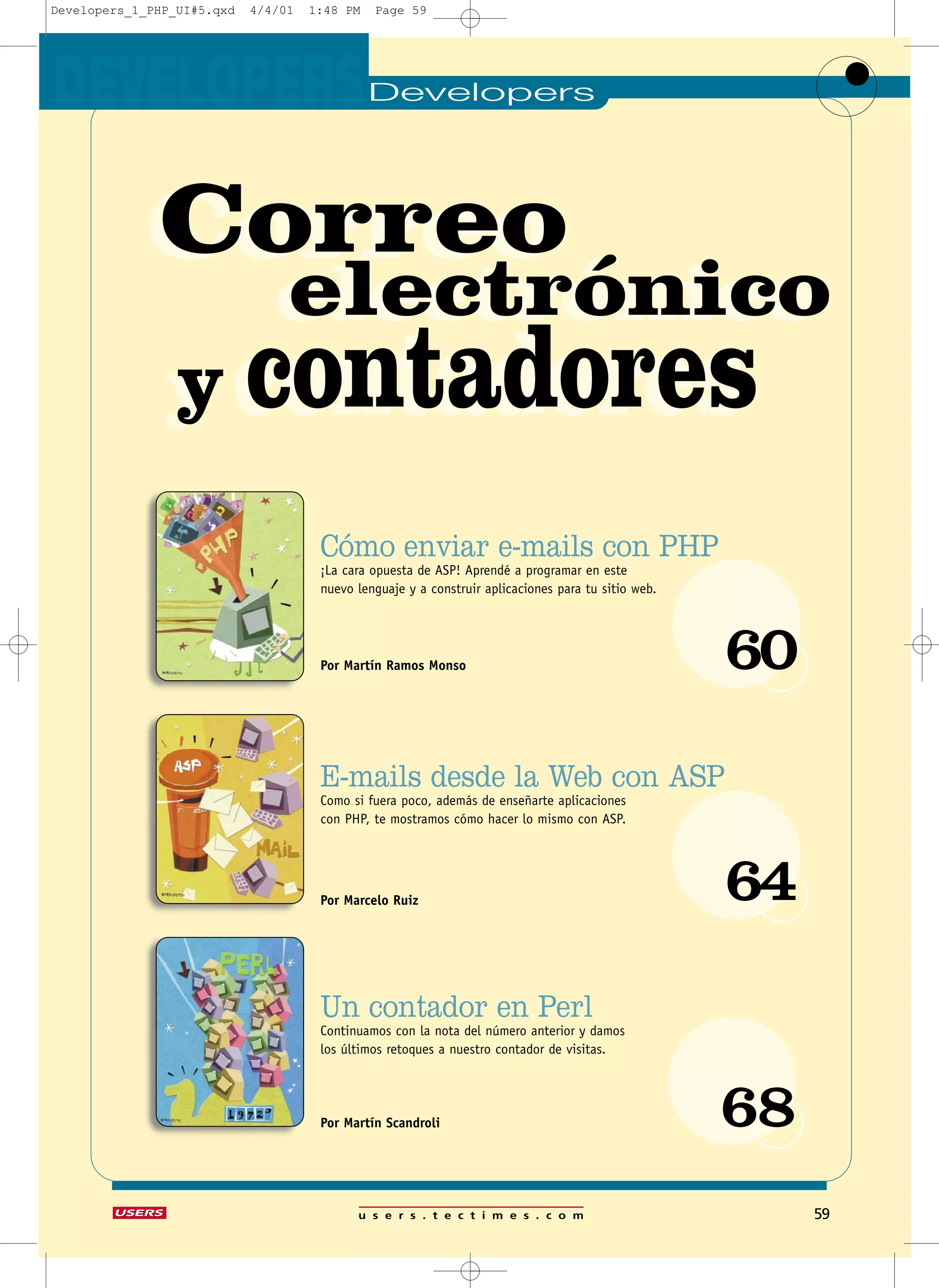 Este documento presenta un tutorial sobre cómo enviar correos electrónicos desde páginas web utilizando PHP. Explica conceptos básicos de PHP y cómo mezclar código HTML y PHP. Luego, muestra cómo crear un formulario, procesar los resultados e implementar diferentes opciones como mostrar los resultados, enviarlos por correo o ambas.