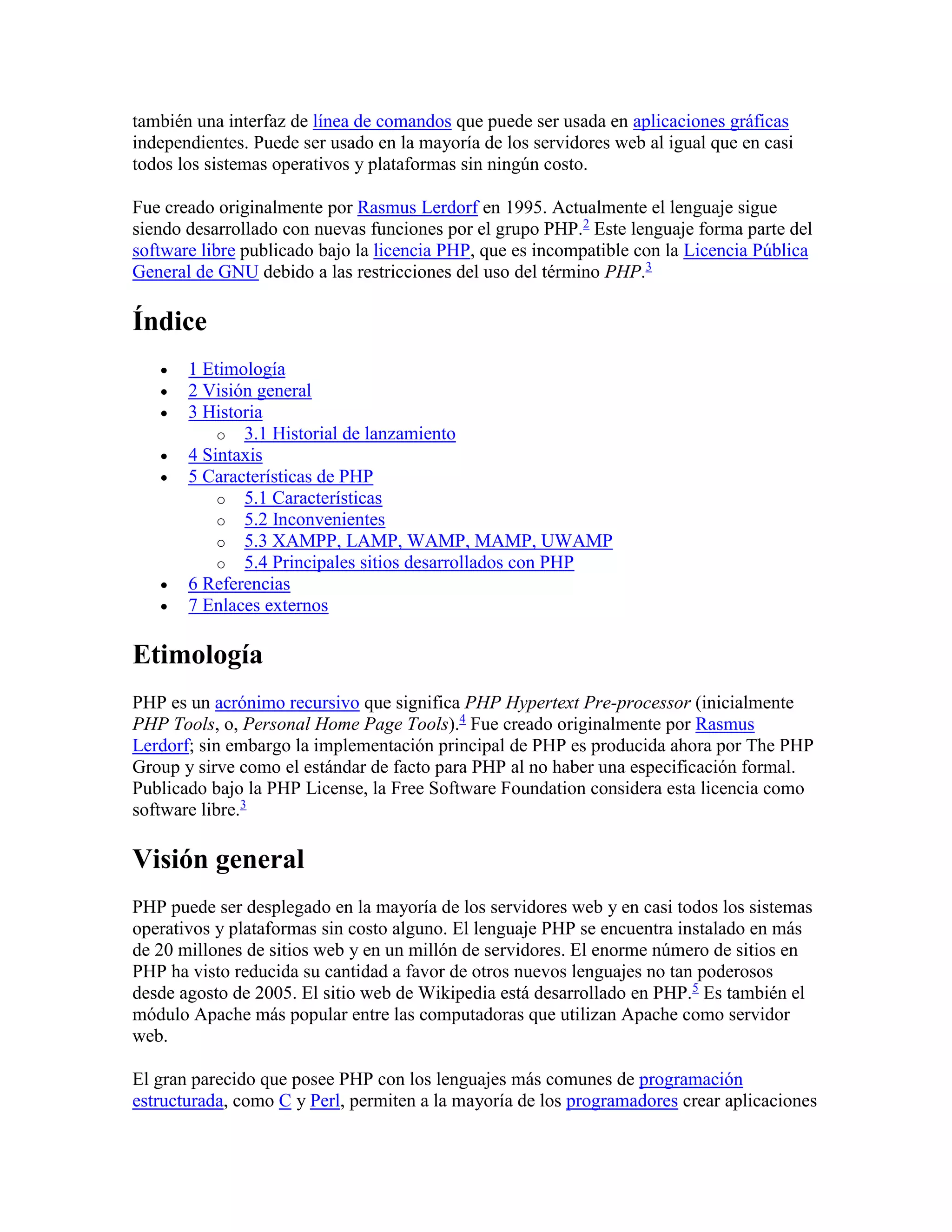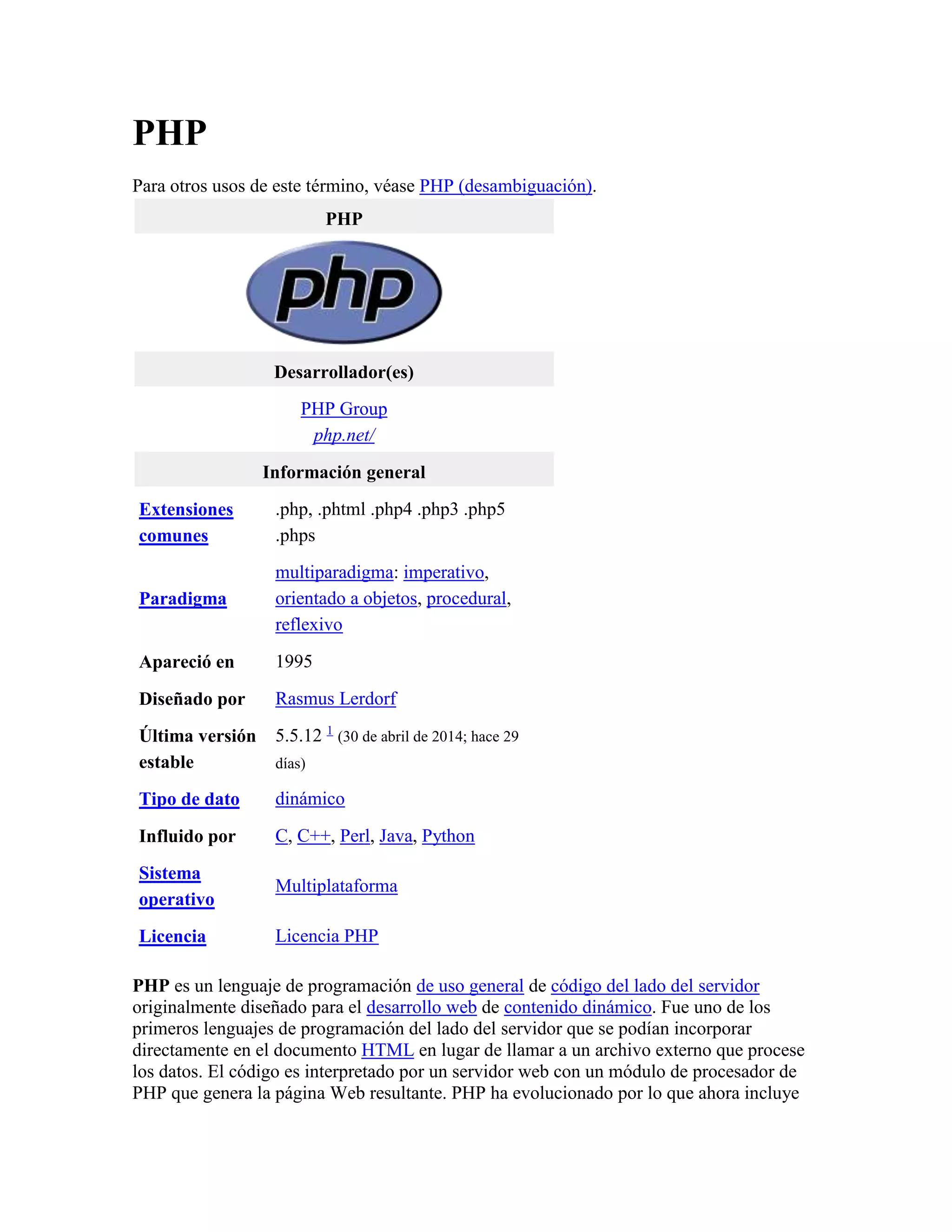 PHP es un lenguaje de programación multiparadigma originalmente diseñado para el desarrollo web. Fue creado en 1995 y sigue siendo desarrollado actualmente. PHP permite conectarse a bases de datos y generar contenido dinámico para sitios web de forma gratuita.