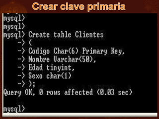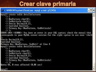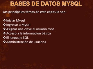 El documento presenta una guía para iniciar y administrar MySQL, incluyendo cómo ingresar y asignar una clave al usuario root. Se describe el uso de SQL, sus comandos principales y los tipos de datos para la creación y manipulación de bases de datos y tablas. También se mencionan funciones útiles para obtener información del servidor y comandos específicos para manejar estructuras de bases de datos.