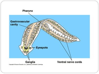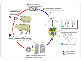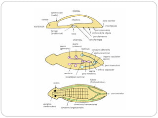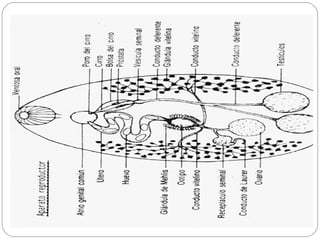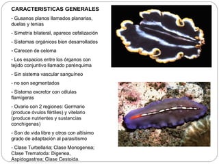 El documento describe las características generales de los platelmintes, incluyendo su simetría bilateral, falta de celoma, sistema digestivo incompleto y reproducción asexual y sexual. Describe las clases principales (Turbellaria, Trematoda y Cestoidea) y sus ciclos de vida, con énfasis en las etapas del ciclo de vida de los trematodos.