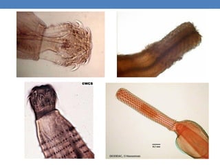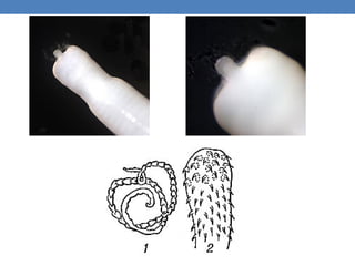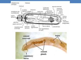 El phylum Acanthocephala, que incluye alrededor de 1200 especies de helmintos parásitos, se caracteriza por su adaptación a la vida parásita, reduciendo sistemas como el digestivo y especializado en parasitar el intestino de vertebrados. Estas especies presentan una morfología compleja que incluye una probóscide, cuello y tronco, y poseen un ciclo de vida que involucra un hospedador intermediario, generalmente artrópodos, para completar su desarrollo. Los miembros de este phylum, como Macracanthorhynchus hirudinaceus y Moniliformis moniliformis, son dioicos y presentan un importante dimorfismo sexual, con las hembras generalmente siendo más grandes que los machos.