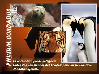 Este documento resume las características y clasificación del filo Cordados. Los cordados se caracterizan por poseer una notocorda y un sistema nervioso dorsal. Se dividen en tres subfilos: cefalocordados, urocordados y vertebrados. Los vertebrados se distinguen por reemplazar la notocorda embrionaria con una columna vertebral y poseer un cerebro dentro de una caja craneana. Se clasifican en varias clases como peces, anfibios, reptiles, aves y mamíferos.