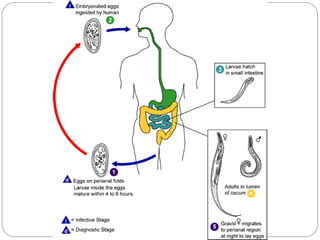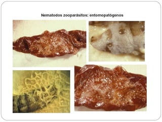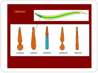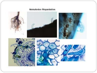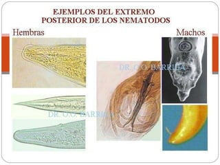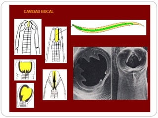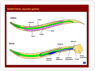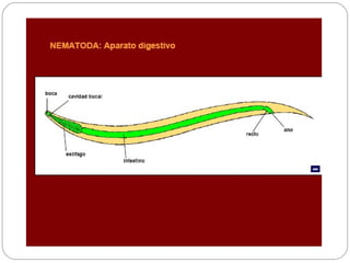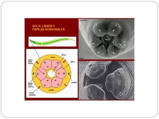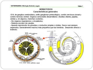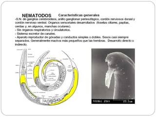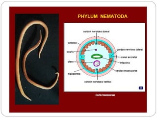 Los nematodos son un filo con más de 25.000 especies registradas, conocidos como "gusanos redondos" debido a su forma cilíndrica. Son organismos pseudocelomados con aparato digestivo completo, excreción a través de células reneta, y ciclo de vida que incluye etapas libres y parasitarias, pudiendo transmitirse por insectos u otros vectores.