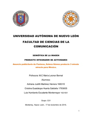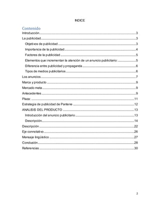 Este documento presenta un análisis semiótico de un anuncio publicitario de 3 minutos del producto Pantene para el cabello protagonizado por Selena Gómez para el mercado mexicano. Inicia con una introducción sobre la publicidad y los anuncios, luego describe la marca Pantene, su mercado objetivo, estrategia y el anuncio analizado, realizando una descripción, análisis del contenido y conclusión.