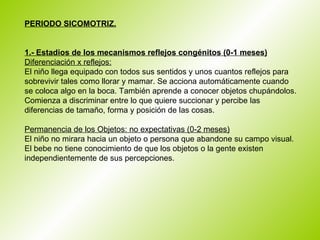 El documento resume los principales estadios del desarrollo cognitivo infantil según la teoría de Jean Piaget. Describe 6 estadios del periodo sensoriomotor (desde el nacimiento hasta los 2 años) y 2 estadios del periodo preoperacional (desde los 2 hasta los 7 años). En cada estadio, se detallan las habilidades cognitivas que van desarrollando los niños, como la permanencia de objetos, la coordinación de esquemas de conducta, el pensamiento simbólico y la representación mental.