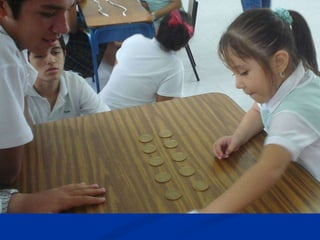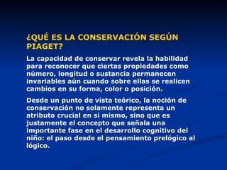 El documento presenta los resultados de un estudio sobre la conservación en niños de 5, 7 y 10 años de edad realizado en el Centro Educativo Piaget. Se aplicaron seis tareas de conservación (número, longitud, sustancia sólida, sustancia líquida, volumen y área) y se observó que a mayor edad los niños lograron conservar en más tareas, mostrando un desarrollo consistente con la teoría de Piaget sobre el pensamiento infantil. Los niños de 5 años no conservaron en ninguna tarea, los de