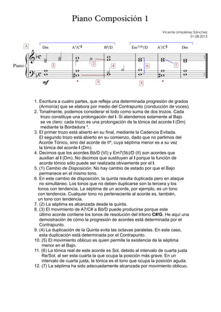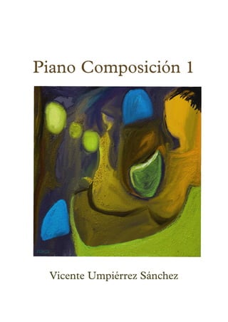 El documento presenta un análisis de composición musical en piano por Vicente Umpiérrez Sánchez, enfocado en la escritura a cuatro partes y el uso de contrapunto para crear progresiones armónicas. Se discuten aspectos como la estructura tonal, la función de acordes y la agrupación rítmica de las voces. Además, se exploran técnicas como la imitación y la repetición para desarrollar la forma musical.