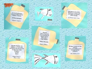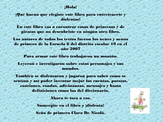 Este libro fue creado por estudiantes de primer grado y contiene diferentes textos sobre piratas y princesas como definiciones, adivinanzas, poemas y cuentos. Los estudiantes investigaron y se disfrazaron de estos personajes para poder escribir sobre sus mundos de una manera creativa. El libro invita al lector a sumergirse en estas historias y disfrutar de la imaginación de los niños.