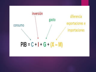El documento define y explica conceptos económicos clave como el Producto Interno Bruto (PIB), Producto Nacional Bruto (PNB), renta nacional, inversión y sus componentes. Explica que el PIB mide la producción final de bienes y servicios, mientras que el PNB solo incluye la producción de factores nacionales. También analiza la importancia del crecimiento del PIB y la renta nacional.